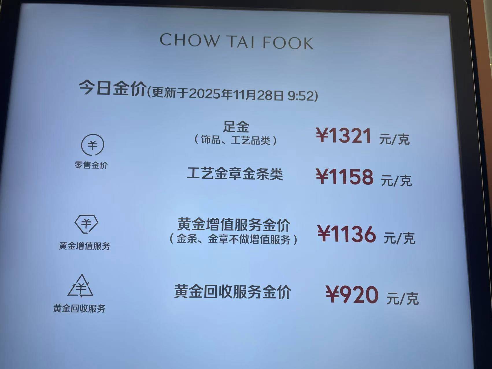 11月28日周大福金价。周良成/摄记者以消费者身份询问营业员:“今年金价涨了这么多,你们店金饰跟去年比好不好卖?”营业员告诉记者:“近期金价超过1300元/克后,确实有不少顾客存在高价观望。但今年销量并不比去年差,该买的还是会买,而且越来越多年轻人开始买金豆子、或金条作为投资。”